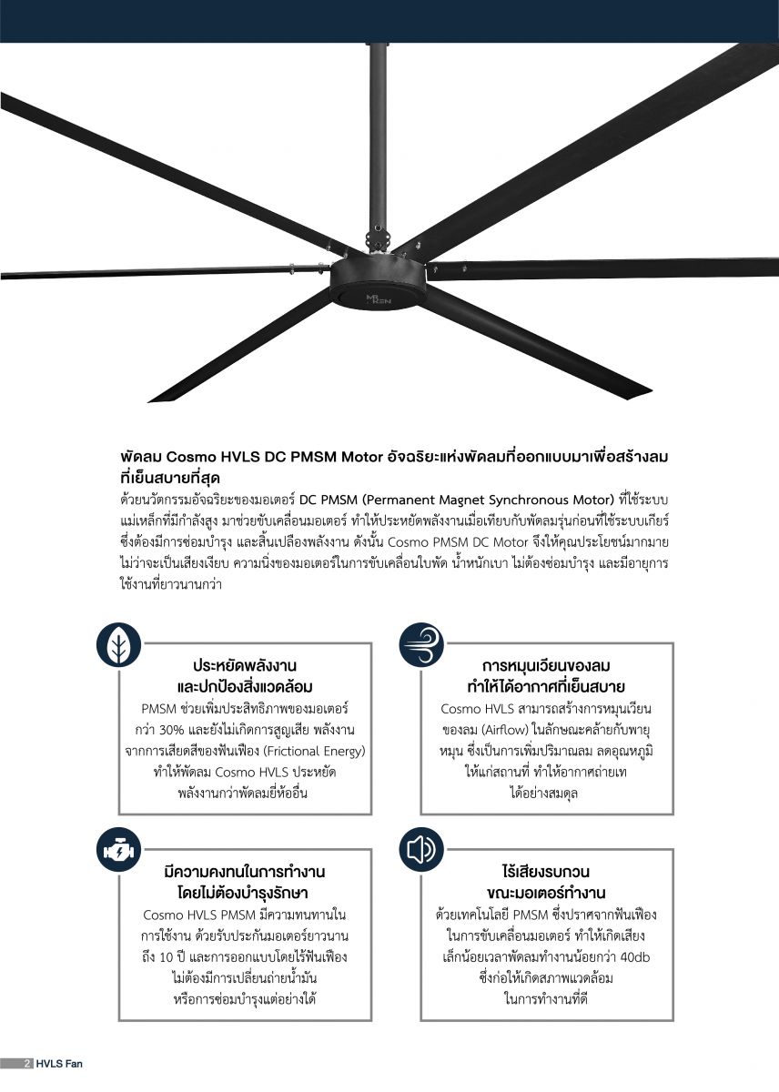 พัดลม Cosmo HVLS DC PMSM Motor อัจฉริยะแห่งพัดลมที่ออกแบบมาเพื่อสร้างลมที่เย็นสบายที่สุด ด้วยนวัตกรรมอัจฉริยะของมอเตอร์ DC PMSM (Permanent Magnet Synchronous Motor) ที่ใช้ระบบแม่เหล็กที่มีกำลังสูง มาช่วยขับเคลื่อนมอเตอร์ ทำให้ประหยัดพลังงานเมื่อเทียบกับพัดลมรุ่นก่อนที่ใช้ระบบเกียร์ ซึ่งต้องมีการซ่อมบำรุง และสิ้นเปลืองพลังงาน ดังนั้น Cosmo PMSM DC Motor จึงให้คุณประโยชน์มากมายไม่ว่าจะเป็นเสียงเงียบ ความนิ่งของมอเตอร์ในการขับเคลื่อนใบพัด น้ำหนักเบา ไม่ต้องซ่อมบำรุง และมีอายุการใช้งานที่ยาวนานกว่า